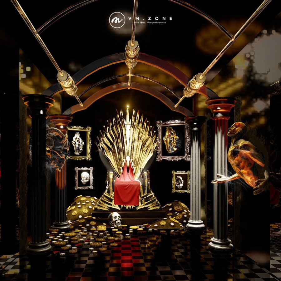Tâm điểm của sự kiện là một ngai vàng ánh kim lấp lánh được đặt ở vị trí trung tâm, bên cạnh một bộ xương được mạ vàng đầy ấn tượng. Đây không chỉ là một đạo cụ trang trí đơn thuần, mà là “signature moment” – điểm nhấn mang tính biểu tượng, khuyến khích khách hàng check-in và lan tỏa hình ảnh sự kiện. VM Zone đã biến mỗi khách mời thành một nhân vật chính trong câu chuyện, nơi họ có thể hóa thân thành những vị thần hay Nữ hoàng của cái chết, nhưng trong một phiên bản đầy quyền lực và lộng lẫy.