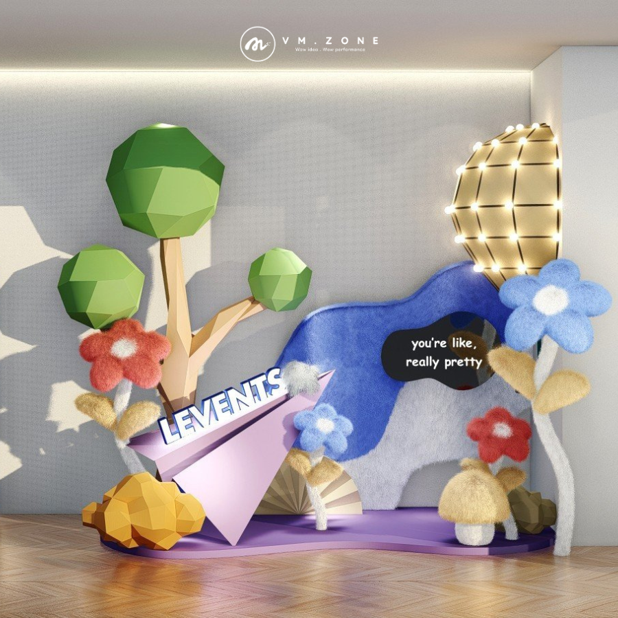Để giải quyết triệt để thách thức về tính độc đáo và tương tác, VM Zone đã lựa chọn một giải pháp táo bạo: Concept "Levents' Dreamy Garden" – Khu Vườn Low-Poly Mộng Mơ. Low-Poly (Đa giác thấp) là một phong cách thiết kế 3D tối giản, thường thấy trong các trò chơi điện tử indie, mang lại cảm giác thế giới hoạt hình/Fantasy rất gần gũi và được yêu thích bởi thế hệ Gen Z. Việc đưa phong cách Low-Poly từ màn hình game ra không gian vật lý thực tế đã biến toàn bộ khu vực khai trương thành một "Ảo Diệu Hiện Thực" (Dream-like Reality), một môi trường độc nhất vô nhị, hoàn toàn phù hợp với tinh thần của một "sân chơi tương tác" thực thụ, mời gọi khách hàng bước vào một cuộc phiêu lưu ngọt ngào.