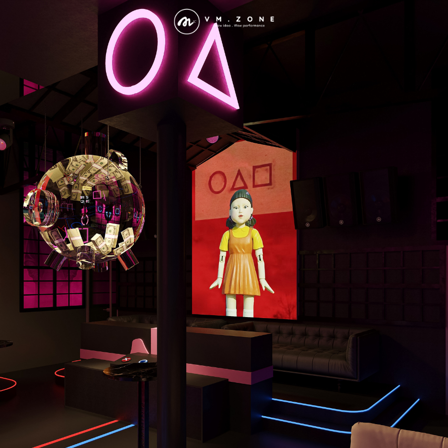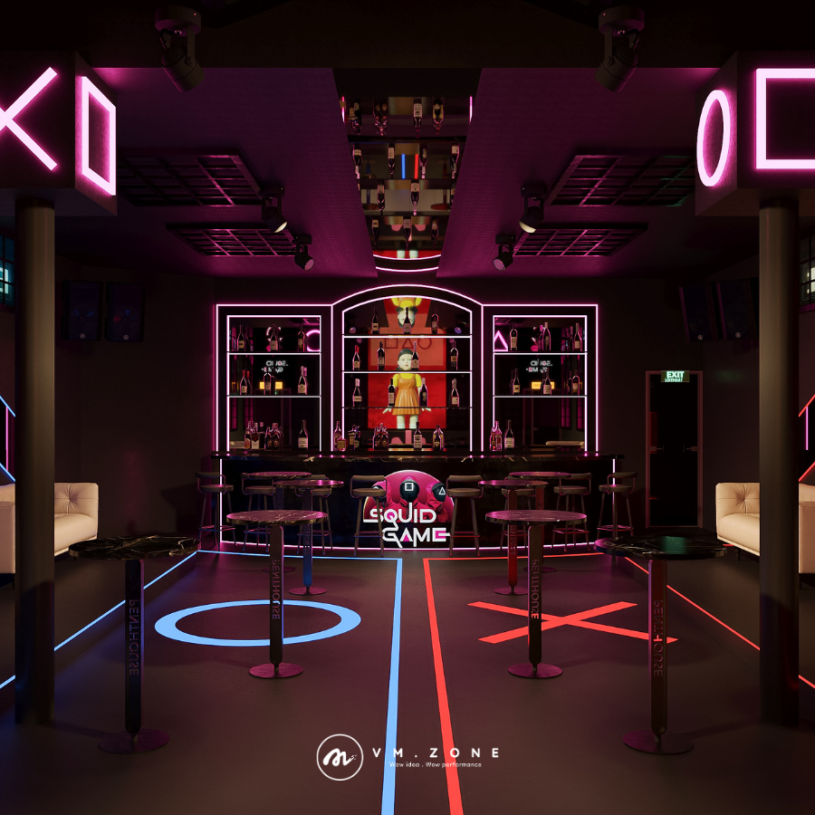 Một dự án quán bar cao cấp tọa lạc tại Biên Hòa đã tìm thấy câu trả lời với một quyết định táo bạo: chọn concept dựa trên chủ đề sinh tồn tâm lý đình đám – nhưng được VM Zone nâng cấp lên một tầm cao triết lý mới: Luxury Dystopia (Sự loạn lạc xa hoa). Đây không chỉ là việc mô phỏng một bộ phim; đây là một tuyên ngôn nghệ thuật được dàn dựng công phu, biến quán bar thành một sân khấu quyền lực nơi ranh giới giữa người chơi và kẻ quan sát bị xóa nhòa, đồng thời là một case study điển hình về khả năng chuyển hóa cảm xúc điện ảnh thành trải nghiệm thương mại đột phá.