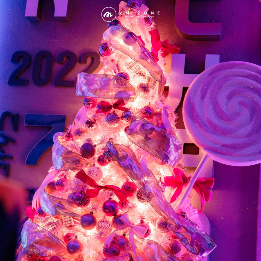 Hai điểm neo ánh sáng là các cây thông trắng/phủ tuyết, được sử dụng làm trụ cột phát sáng, tắm mình trong đèn hồng neon mạnh mẽ. Các cây thông, trang trí bằng ruy băng lụa và quả châu tông hồng, phản chiếu lại ánh sáng, tạo ra hiệu ứng phát sáng từ bên trong, hoàn hảo cho không khí tiệc tùng.