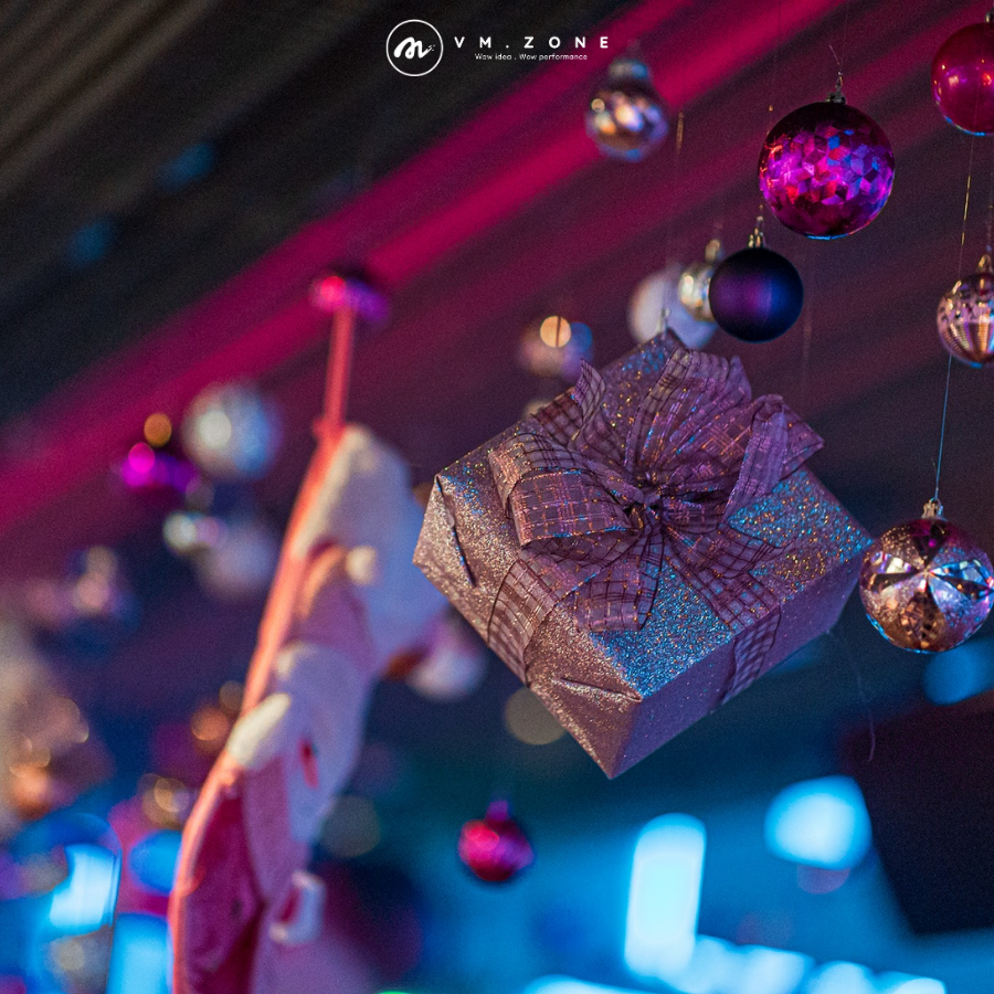 Các hộp quà và quả châu được treo thả từ trần nhà ở nhiều độ cao, kết hợp với ánh sáng tím và xanh lạnh của bar. Kỹ thuật này tạo ra hiệu ứng không gian đa chiều, ảo diệu và huyền bí, biến mọi góc độ chụp ảnh thành một trải nghiệm sống động, tăng cường cảm giác xa hoa cho khu vực bar.