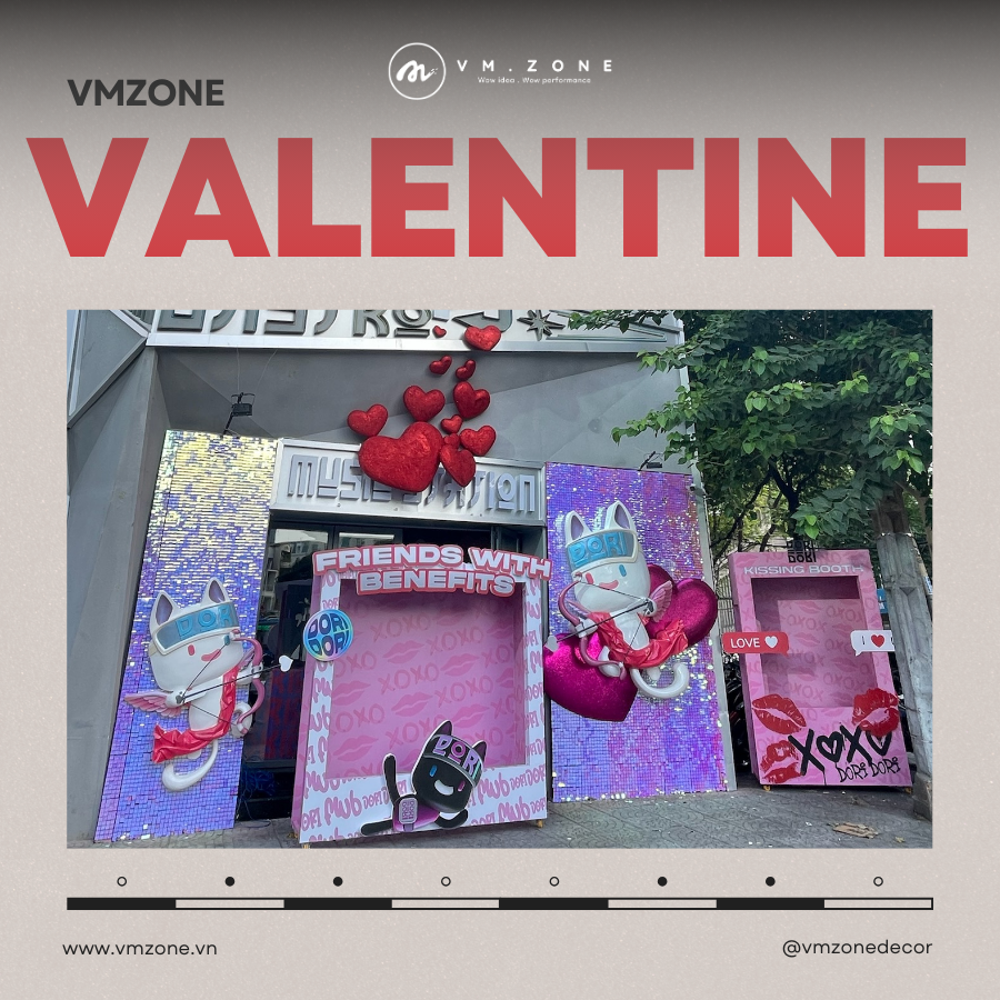 VM ZONE hiểu rằng, một mặt tiền đẹp phải đi đôi với tính tương tác. Chúng tôi đã thiết kế các cụm Photo Booth độc đáo với thông điệp "Friends with Benefits" và "Kissing Booth".